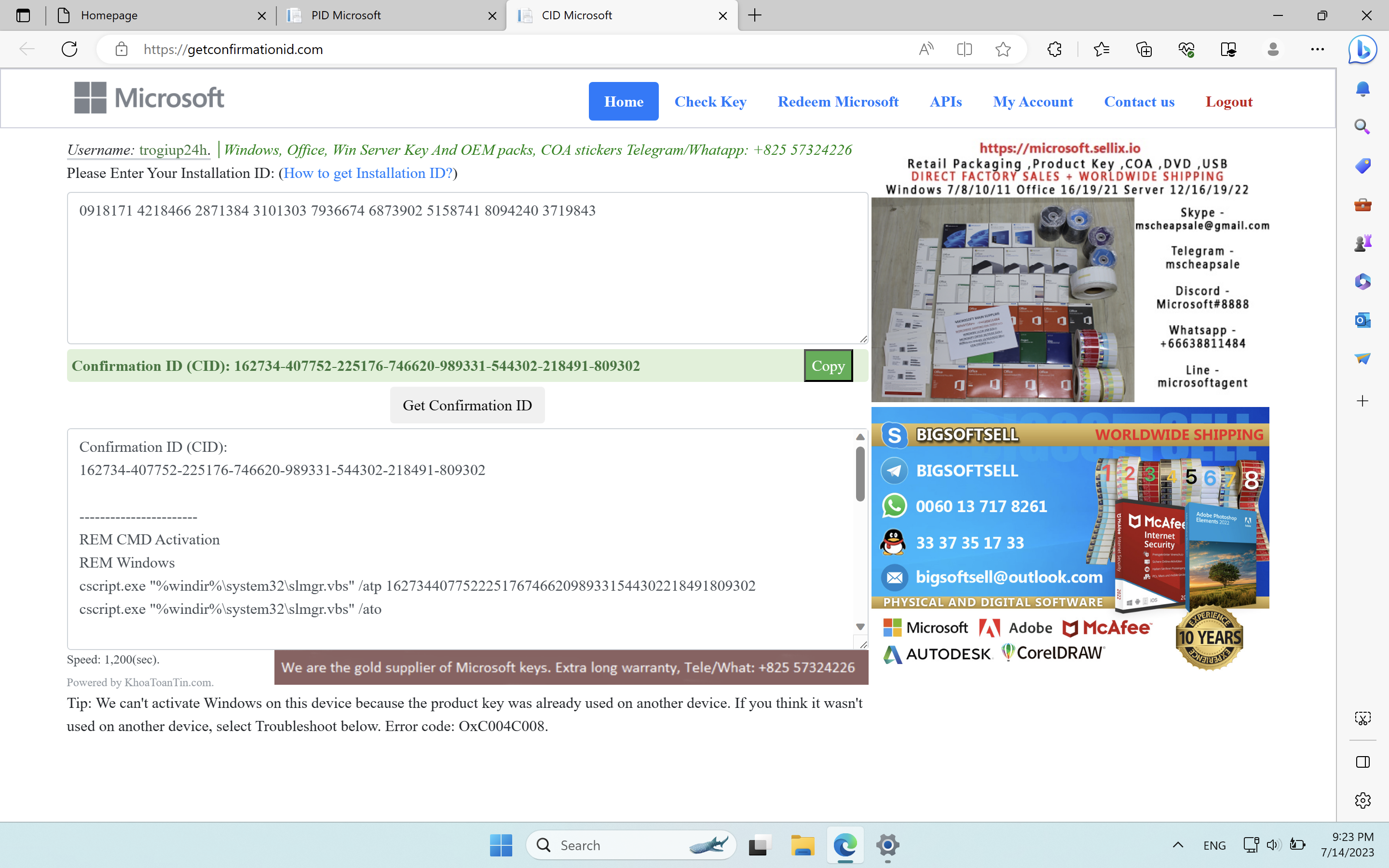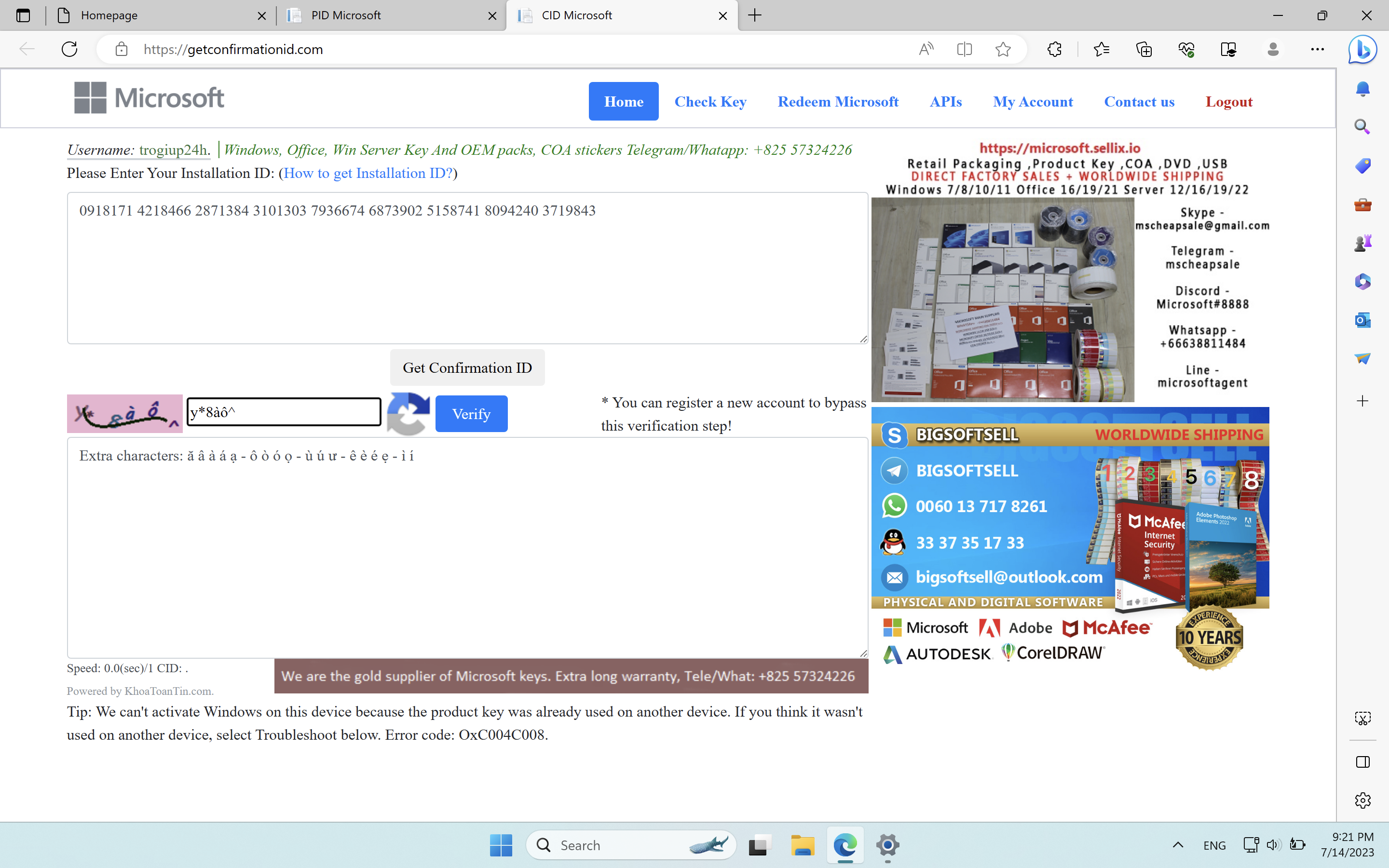 If you are not in United States or United Kingdom, please go to website http://pidkey.com/cidms and enter IID and verification code to get CID. The username is "trogiup24h", and the password is "PHO", too. You might be wait for one or two minutes to get CID.