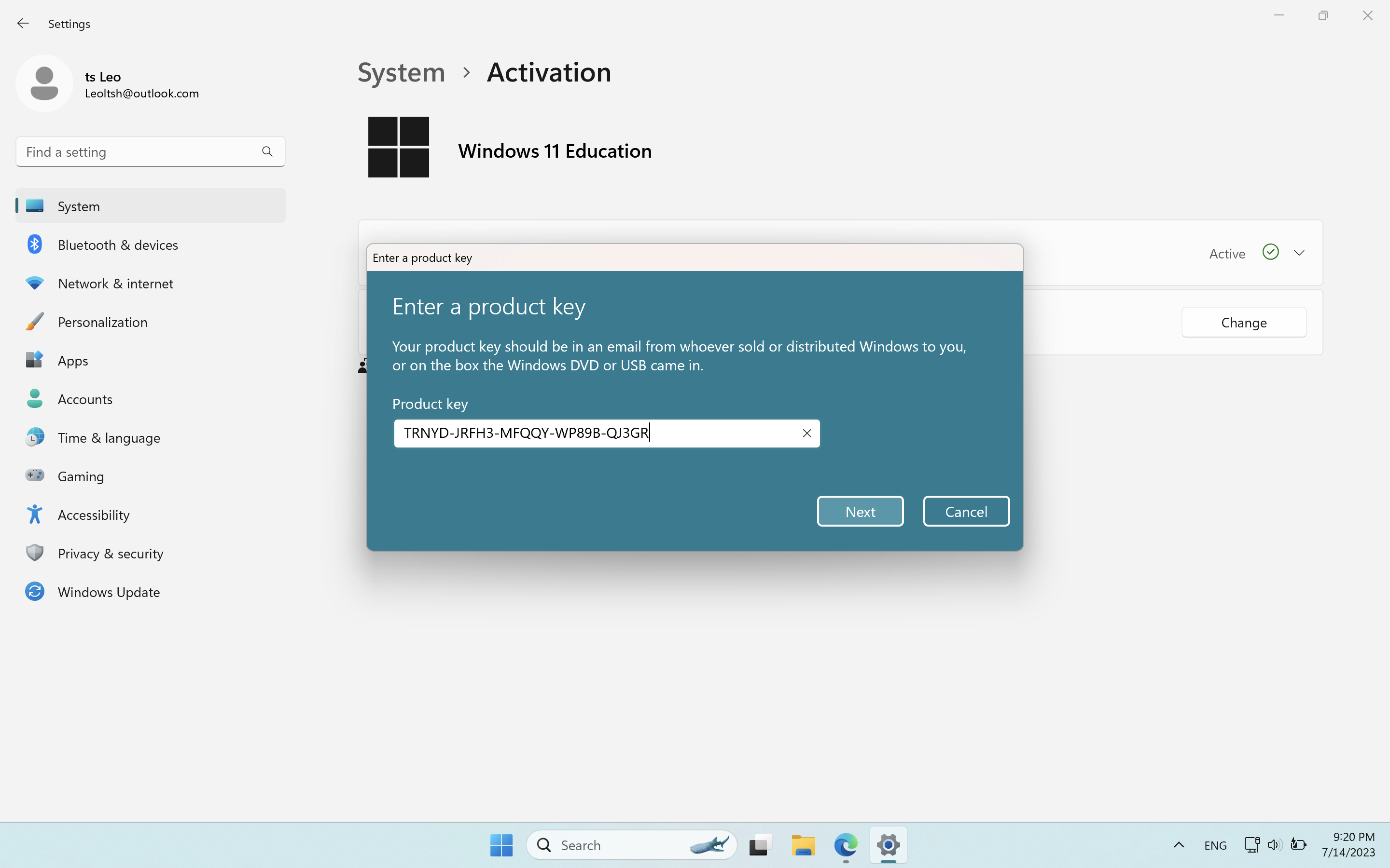 Second, go to settings > system > activation. Press change. Enter the key and press next, then activate.